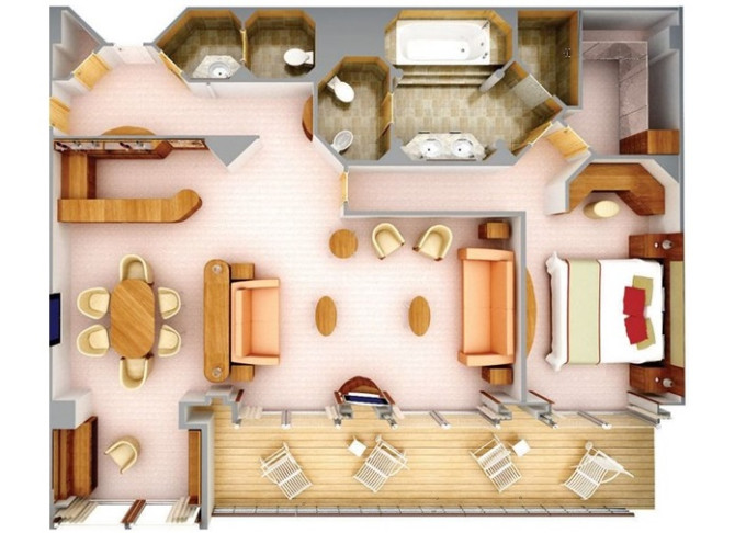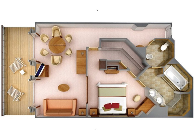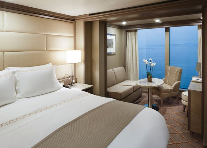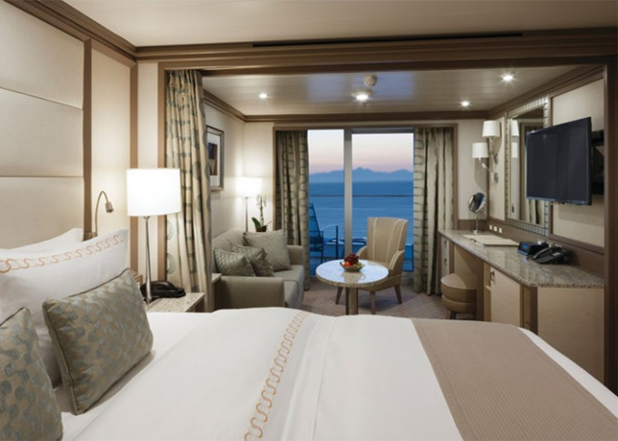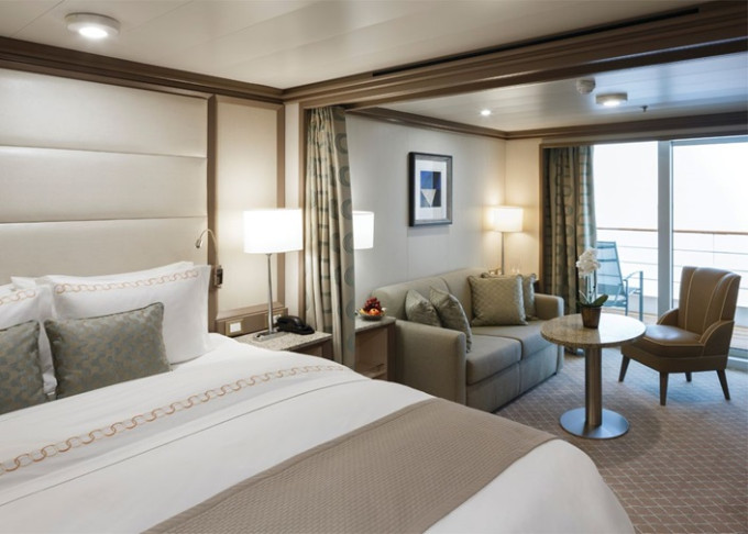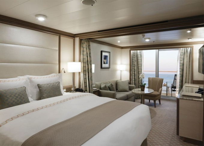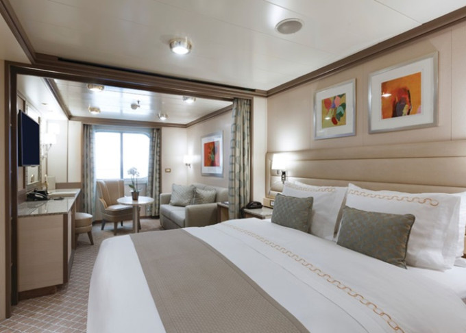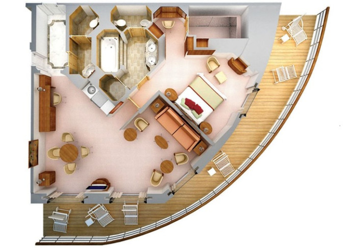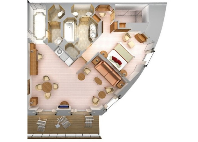 | R1 - Royal Suite 1 92 m² (vrátane balkóna 12 m²), Spálňa s obývacou a jedálenskou časťou. 7. paluba vpredu. Max 3 osoby. | 47 700 € 15 900 € za osobu | ||