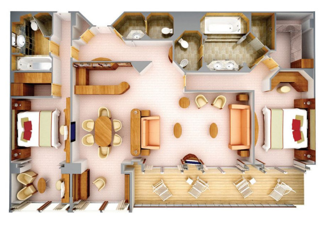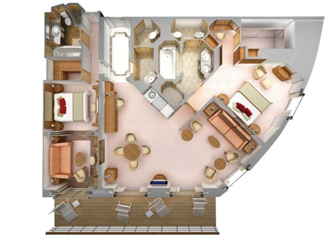 | R2 - Royal Suite 2 127 m² (vrátane 18 m² balkónov). Royal Suite prepojená s Veranda Suite. 7. paluba vpredu. Max 5 osôb. | 69 000 € 23 000 € za osobu |