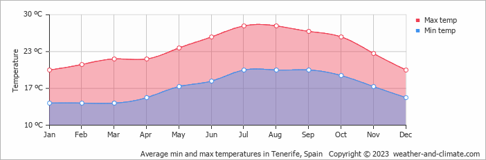 Priemerné minimálne a maximálne teploty v Santa Cruz de Tenerife.